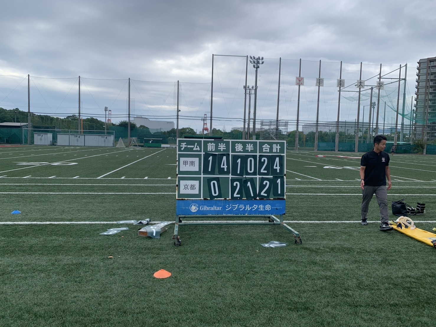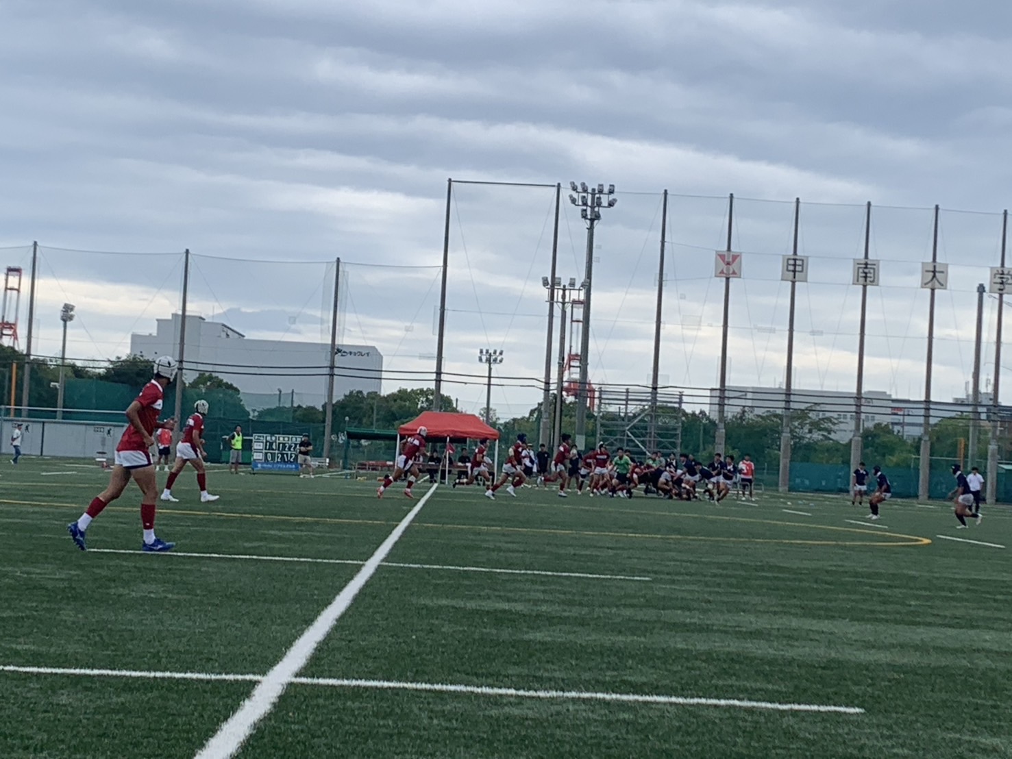 本日13時KO 甲南六アイG 晴れのち曇 少し蒸し暑さを感じる天候でしたが、ラグビー日和なコンディションでの試合だったのでは。結果は、24-21(前半14-0)で甲南大学が競り勝った。後半京都に追い上げられてヒヤヒヤしたが、甲南の粘り強い守りが勝り、最後は反則をもぎ取ってノーサイドとなった。甲南高校出身者も多数試合に出ててグランドで活躍する姿を見れて良かったです。これで甲南大学はリーグ戦連勝、次戦は大阪体育大学に挑みます。